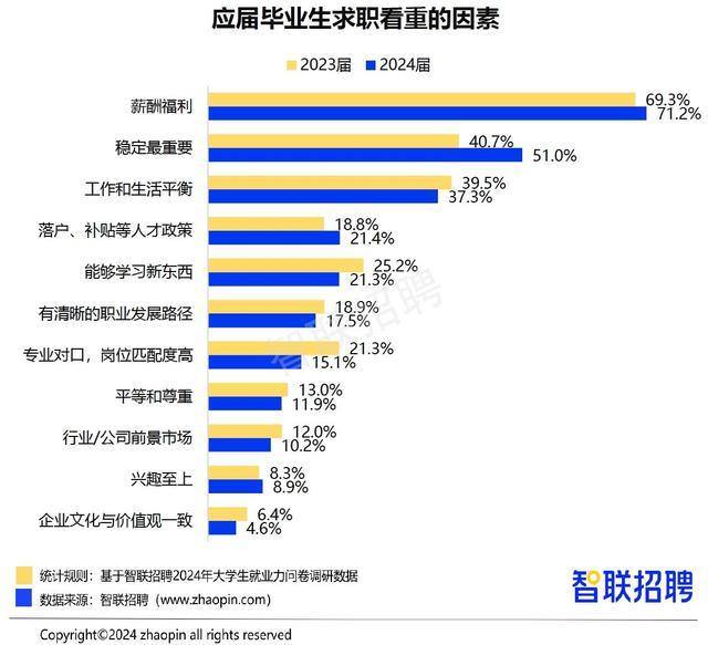 报告提到,从求职考虑的因素也能看出,应届生毕业生对工作稳定性的重视度在提高。调研显示,2024届求职毕业生中,51%认为“稳定最重要”,比例仅次于“薪酬福利”(71.2%),位列第二。与去年相比,认为“稳定最重要”的比例提升10个百分点。